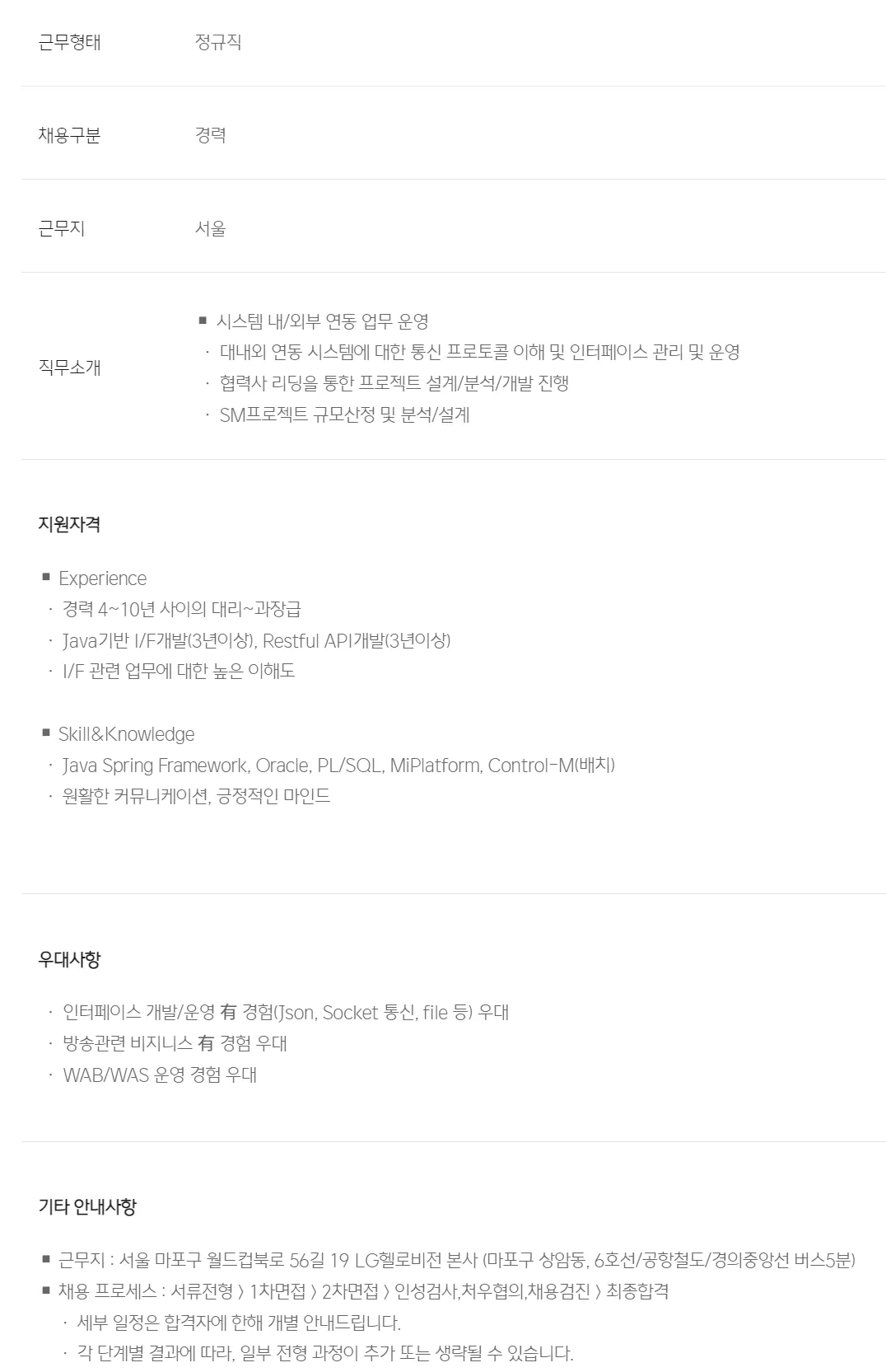 해당 I/F 분석/설계/개발 또는 운영 경력자를 우대하며 WEB, WAS 연동 및 최적화, 장애 대응 경험 우대합니다.