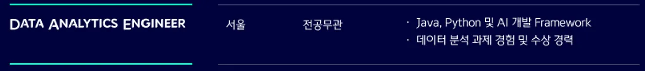 데이터 수집 및 워크플로우 솔루션에 대한 경험이 있다면 더 좋으며 대부분의 Legacy 프로그램들이 Java로 개발되어 있기 때문에 Java에 대한 이해와 분석 과제를 수행하기 위한 Python 그리고 Linux 커맨드 및 SQL에 대한 기초적인 지식이 필요합니다.