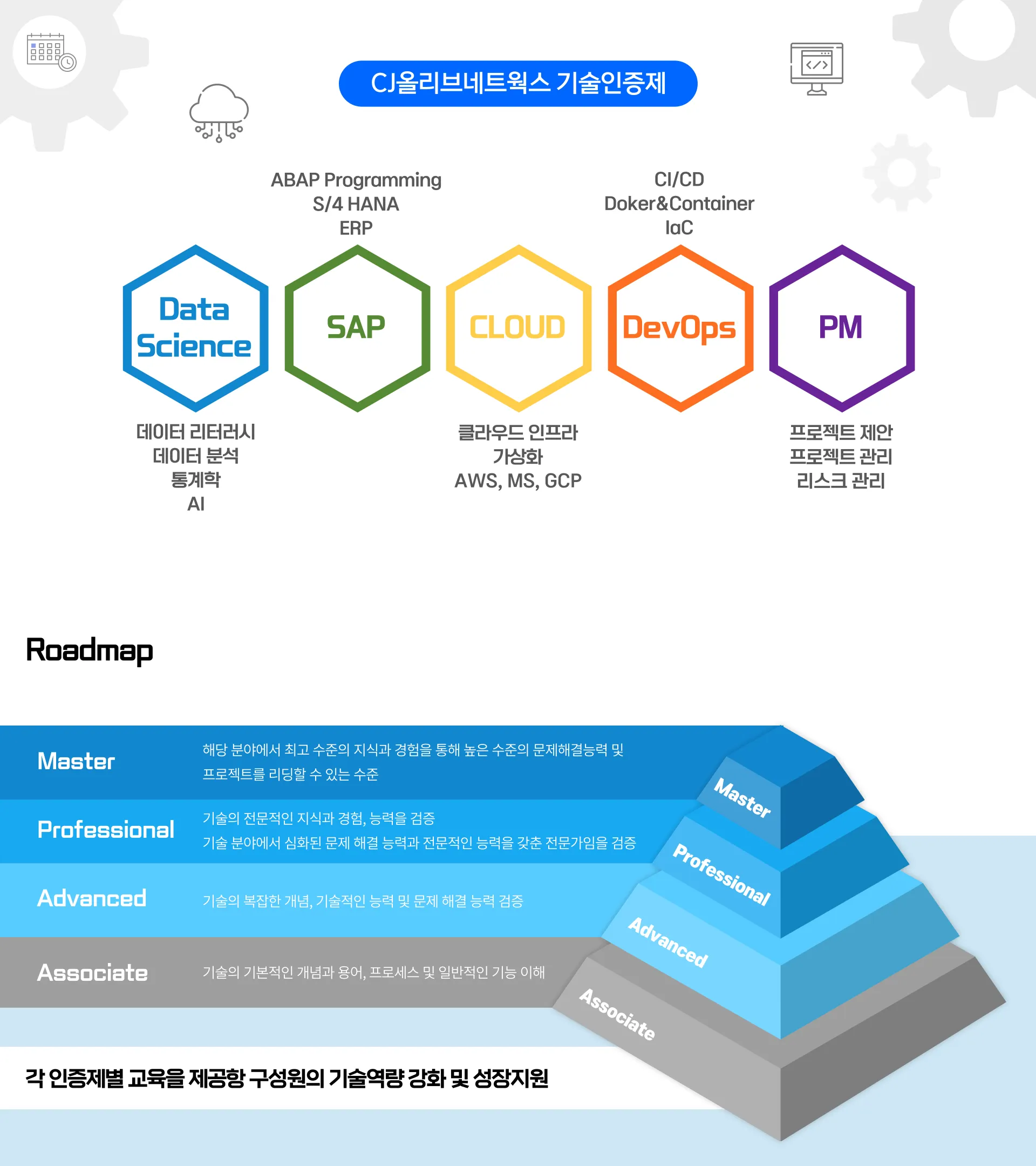 Data Science, SAP, Cloud, DevOps, PM 5가지 분야의 기술인증제를 운영하고 있어요.