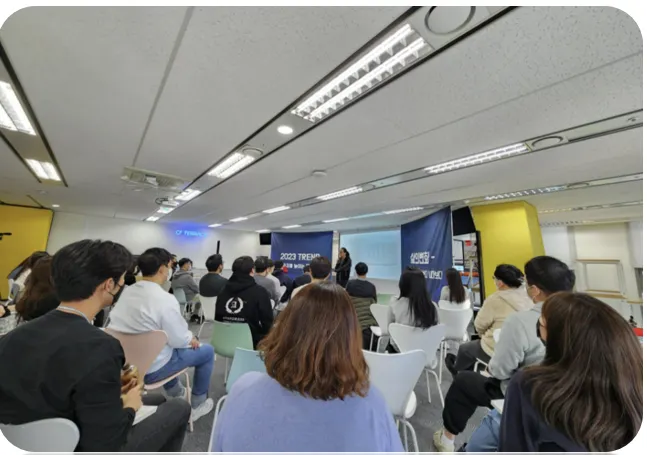 "우리 회사는 사내,외 연사들을 모시고 Tech Talk, Tech Trend, Tech Meet up 등 세미나를 자주 진행하니 발빠르게 IT Trend 파악할 수 있어서 참 좋아요" by People Recruiting팀 김새인님
