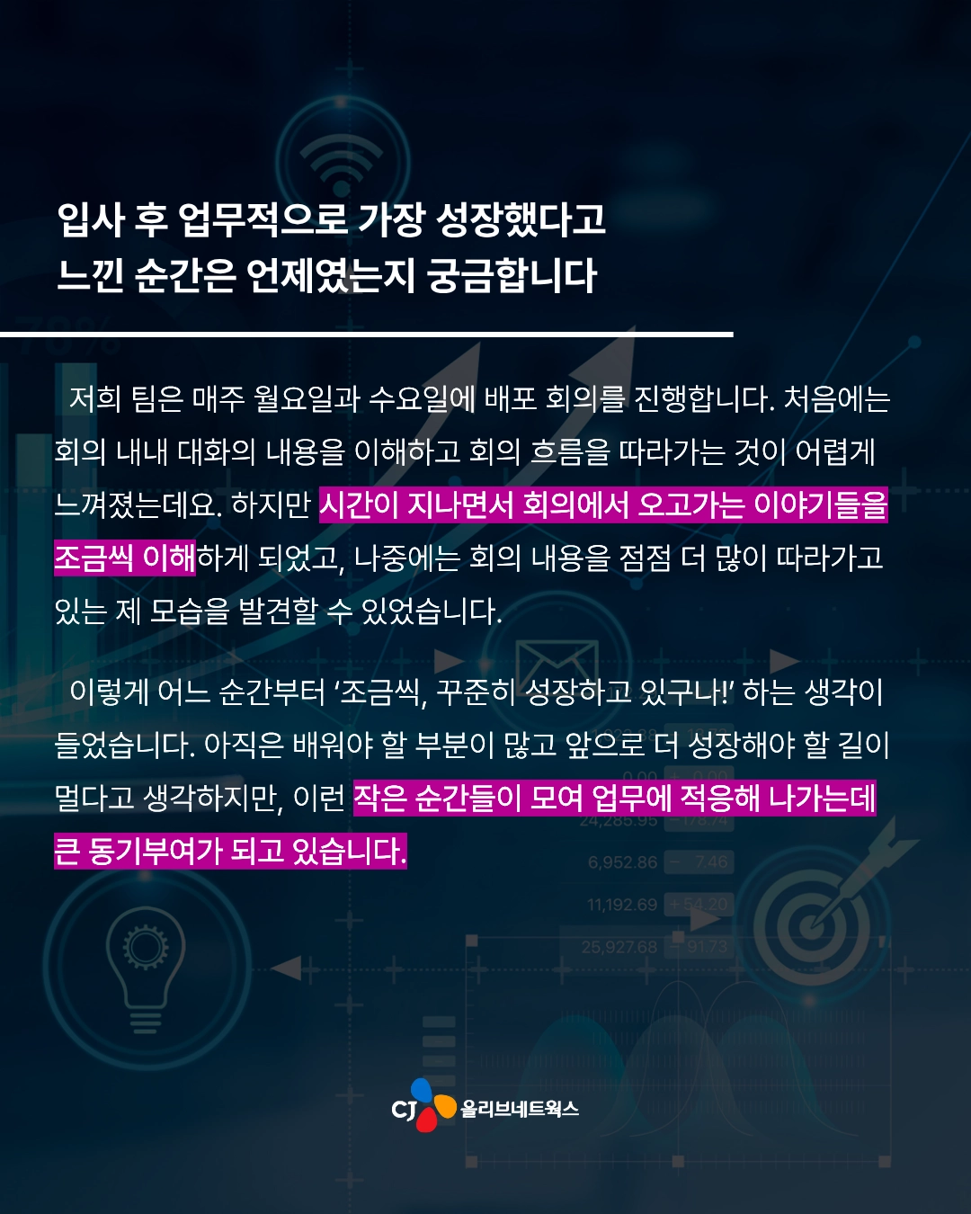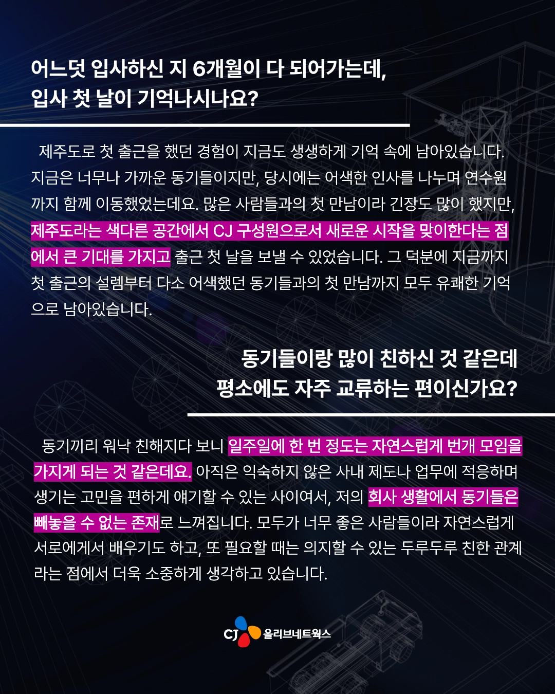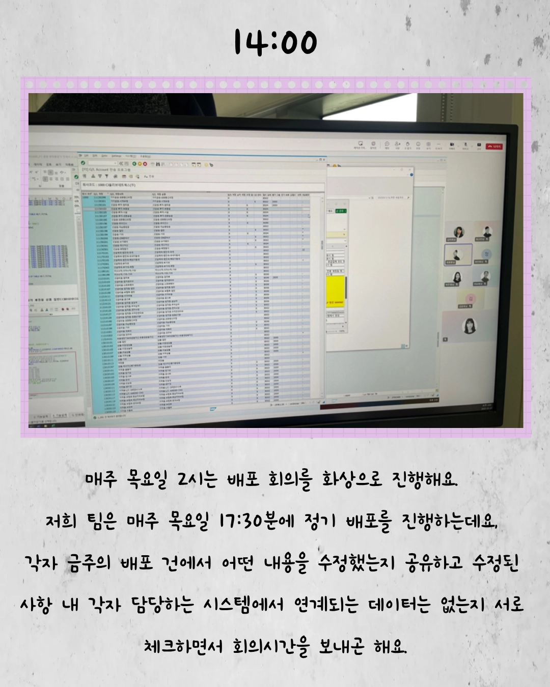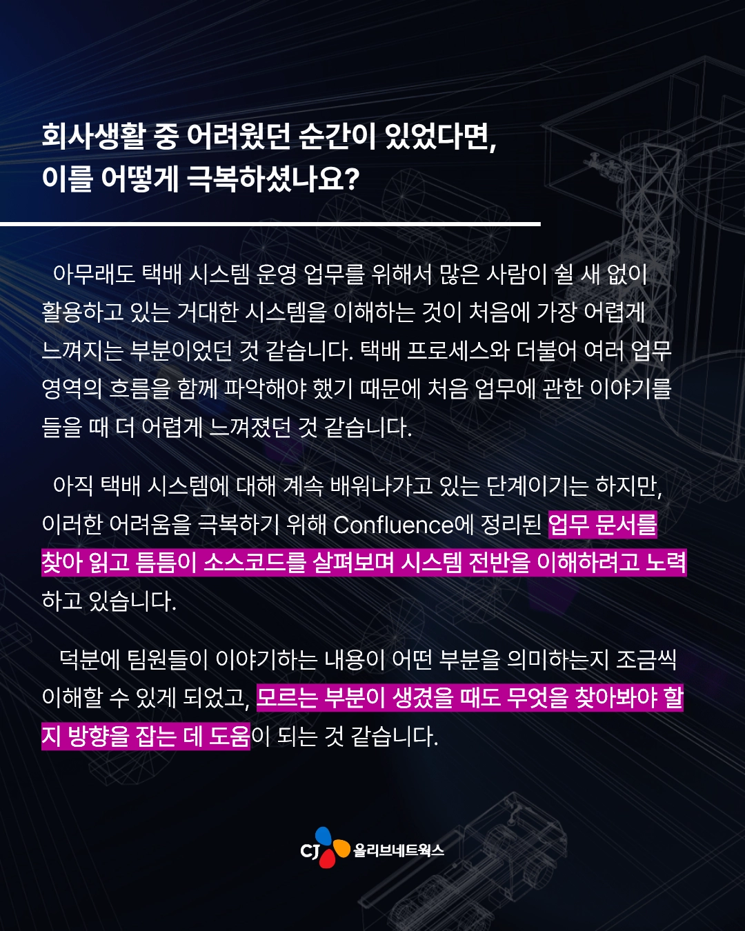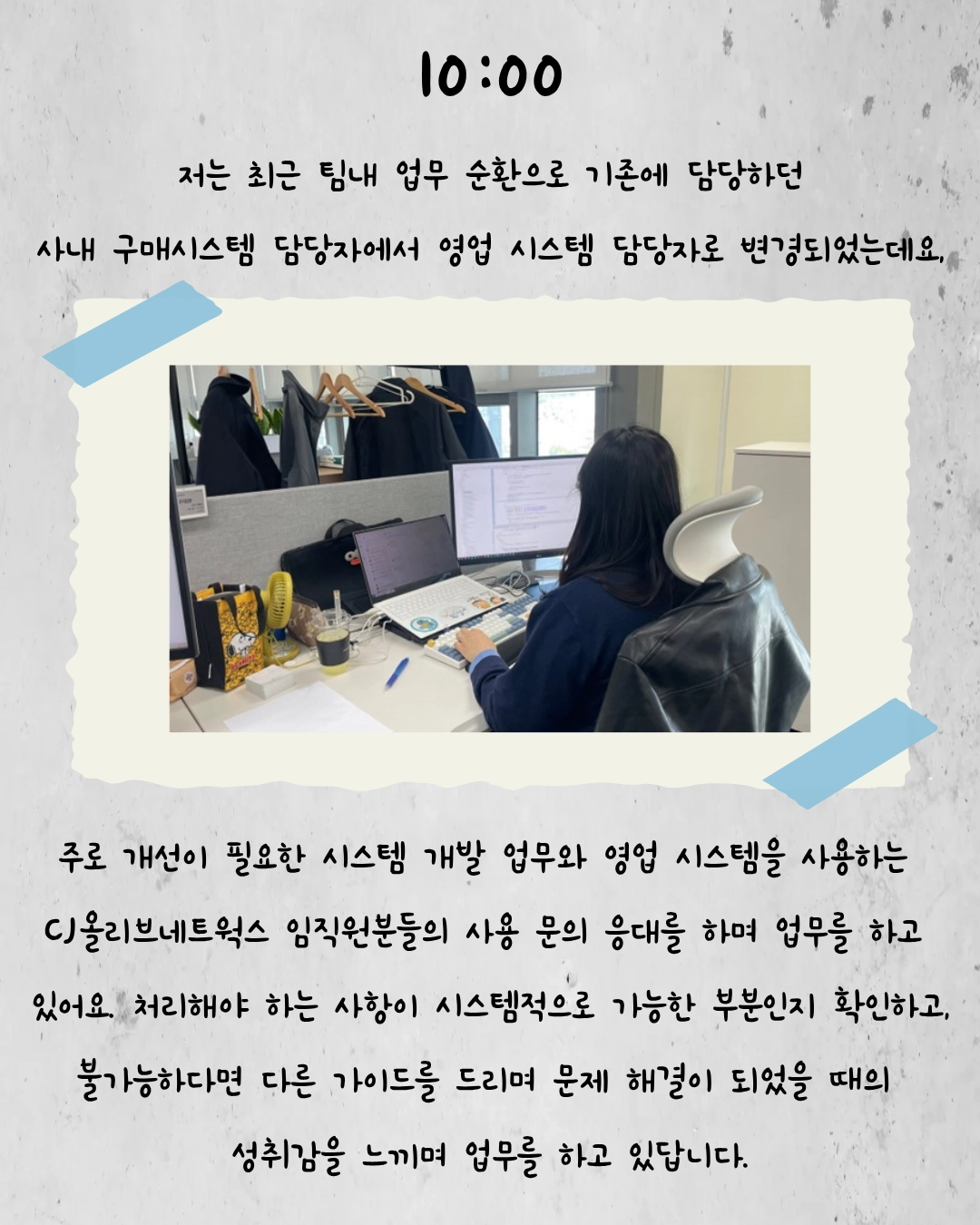 저는 처음에 Business System Engineer로 입사해서 전국 매장에서 주문을 생성하는 제일제당 영업사원 시스템을 담당했어요. 그리고 당시에 OJT(On the Job Trainig) 과제로 일일점검 시스템을 개발했는데요. 해당 시스템은 단순 과제로 그치지 않고 기존 시스템을 대체한 다음 지금까지도 제일제당 대상 서비스를 제공하는 8개 팀으로 확산하여 매일 사용되고 있습니다. 처음 기획했을 때보다 훨씬 큰 규모로 성장한 프로젝트라 매우 뿌듯함을 느끼고 있어요.ㅎㅎ