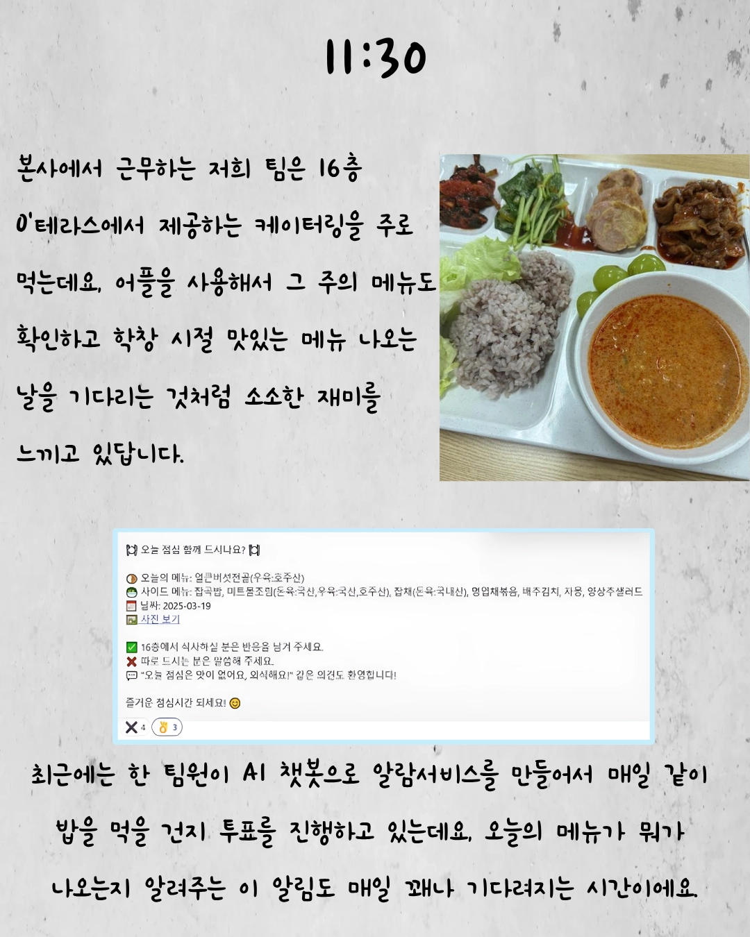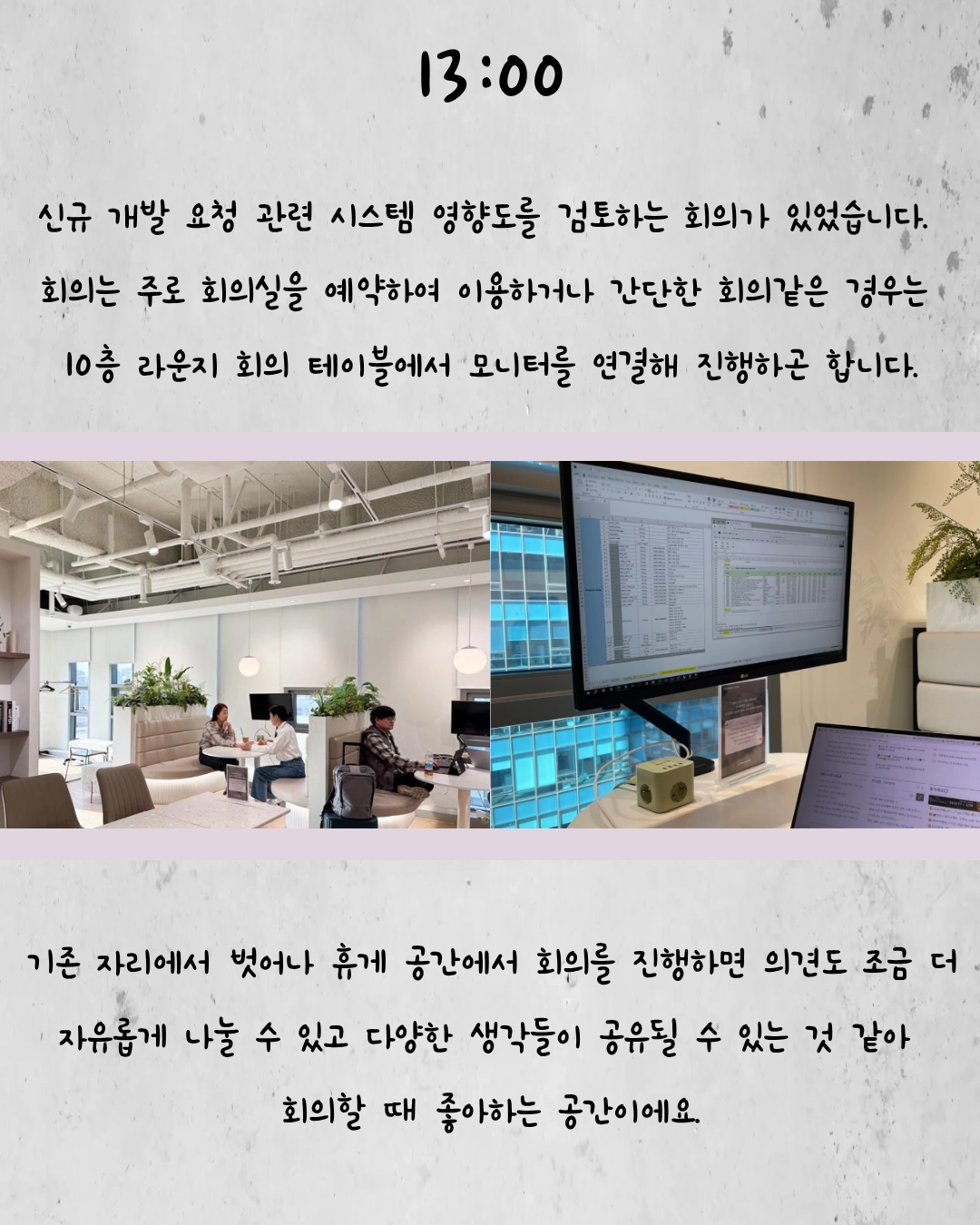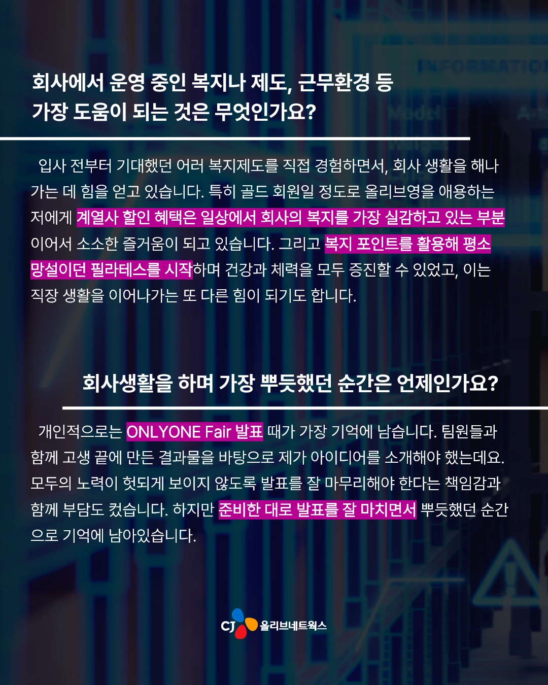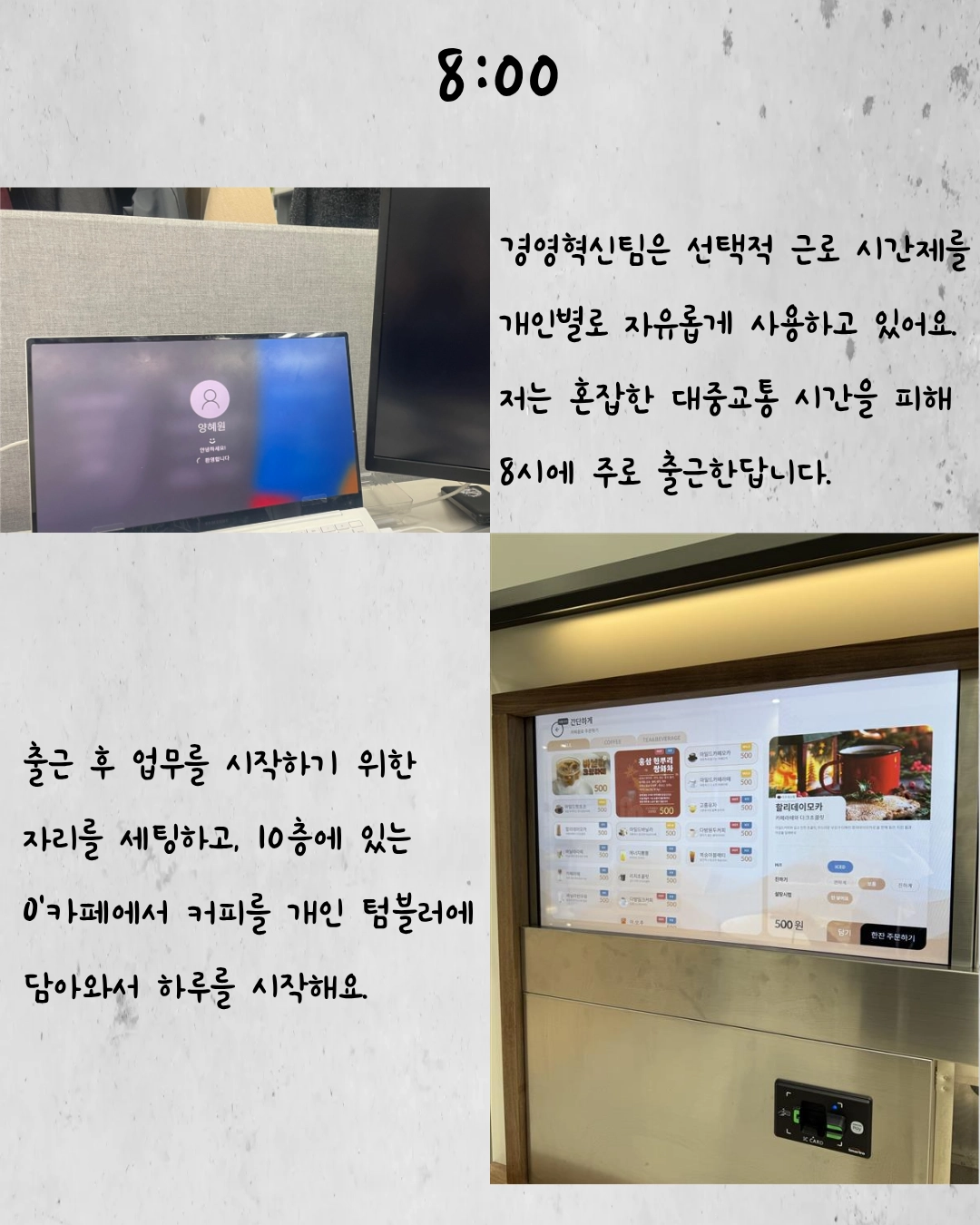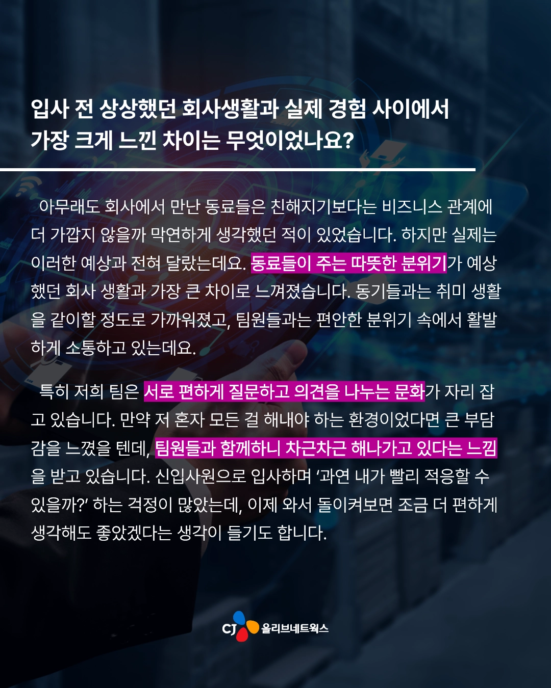 저는 처음에 Business System Engineer로 입사해서 전국 매장에서 주문을 생성하는 제일제당 영업사원 시스템을 담당했어요. 그리고 당시에 OJT(On the Job Trainig) 과제로 일일점검 시스템을 개발했는데요. 해당 시스템은 단순 과제로 그치지 않고 기존 시스템을 대체한 다음 지금까지도 제일제당 대상 서비스를 제공하는 8개 팀으로 확산하여 매일 사용되고 있습니다. 처음 기획했을 때보다 훨씬 큰 규모로 성장한 프로젝트라 매우 뿌듯함을 느끼고 있어요.ㅎㅎ