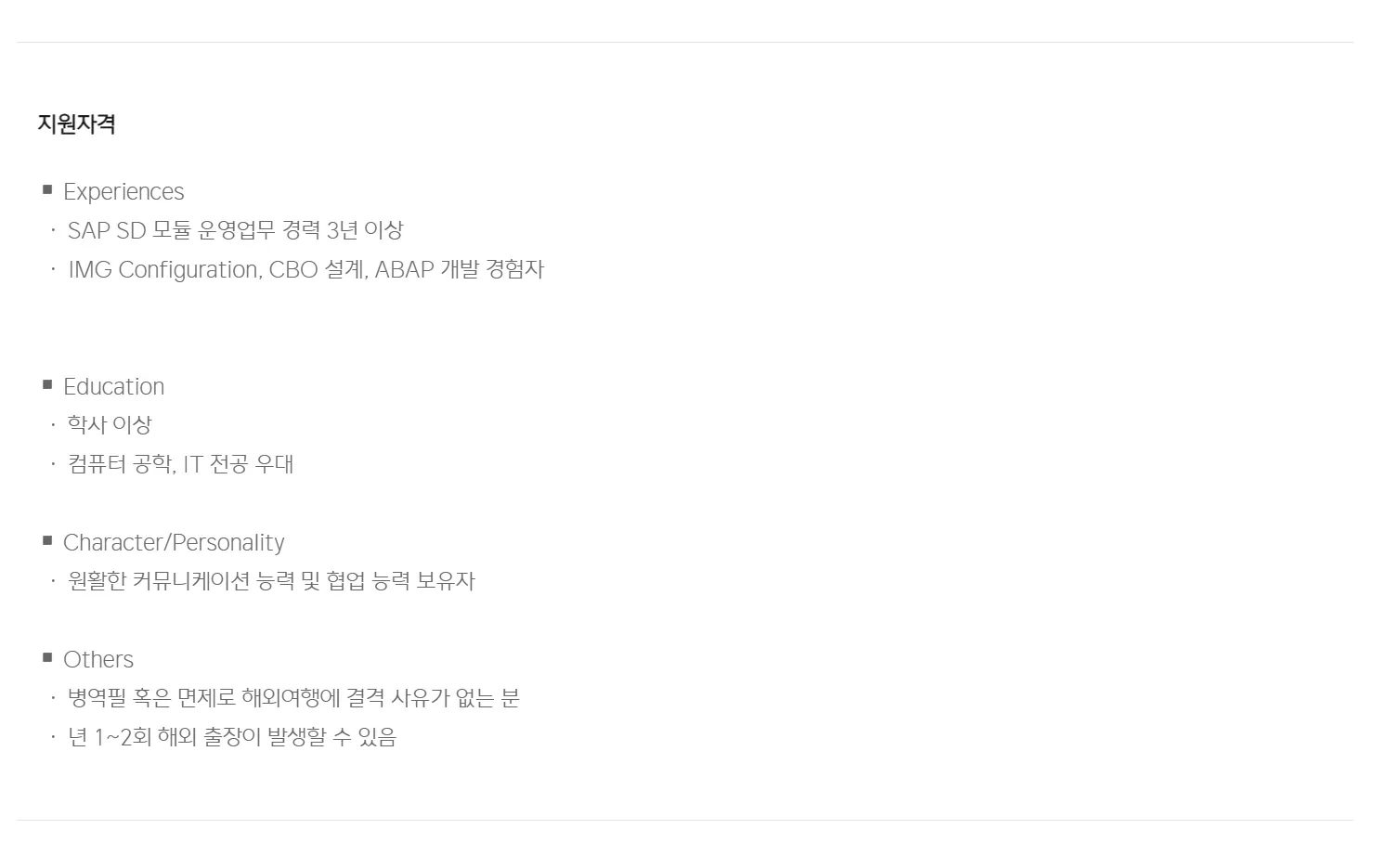 JD 중 자격요건에 운영 경력, IMG, CBO설계, ABAP 등에 대한 요건이 나와있어요. 해당 항목들은 어떤 기준으로 보고 계신지 궁금해요!
