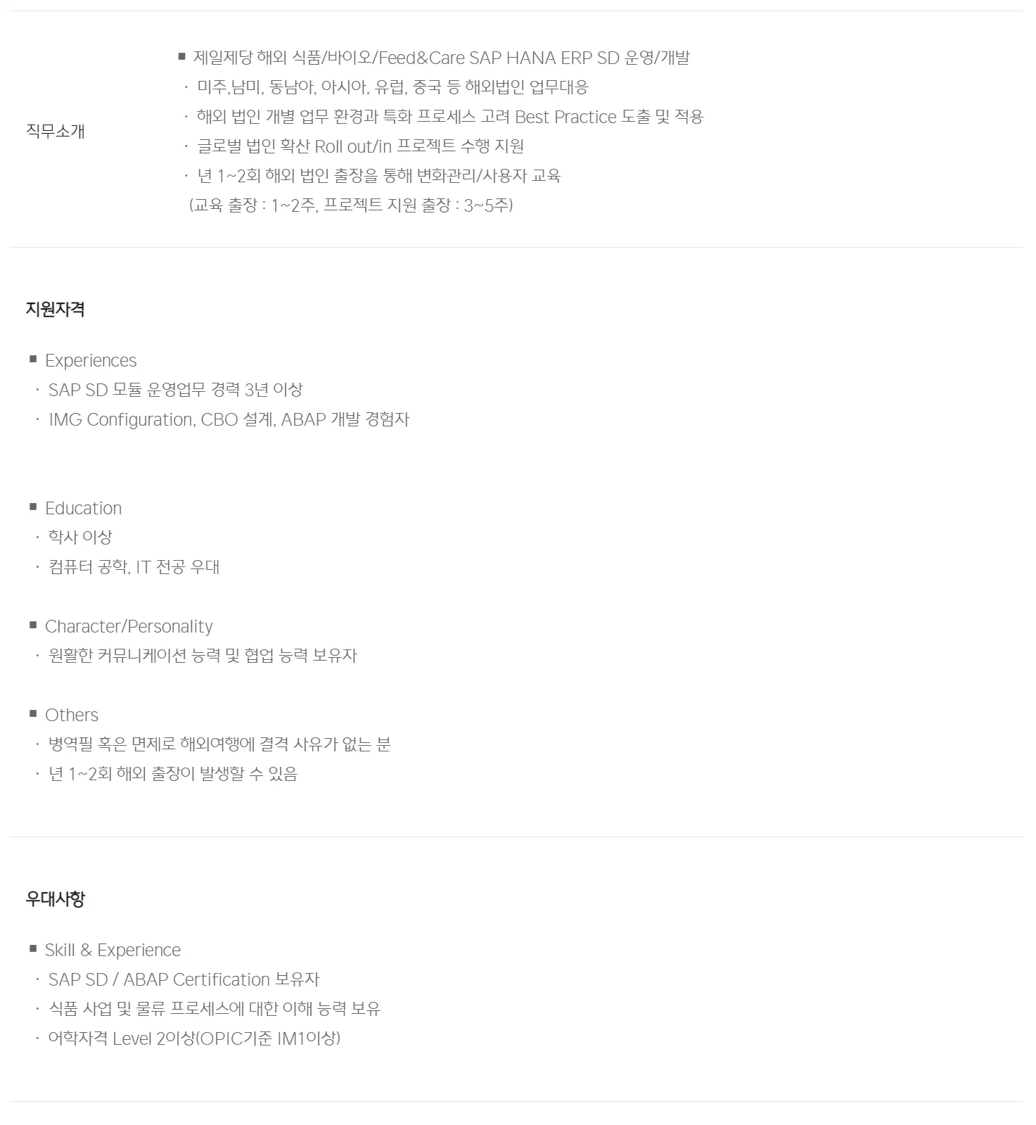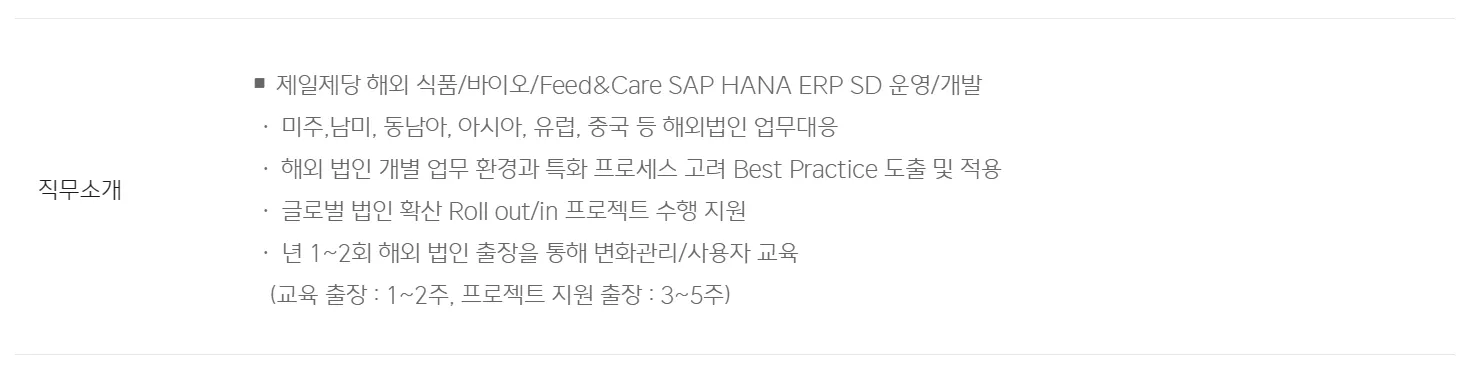 저희팀에서는 CJ제일제당 바이오 사업부문, 식품 사업부문, Feed&Care라는 제일제당 자회사의 ERP 업무를 담당하고 있구요! 해당 포지션은 CJ제일제당 바이오 사업부문의 SAP SD 업무를 맡아 운영과 개발하게 될 예정이에요. 현재 제일제당 해외 ERP 중 SD 모듈은 4명으로 구성 되어 있습니다.