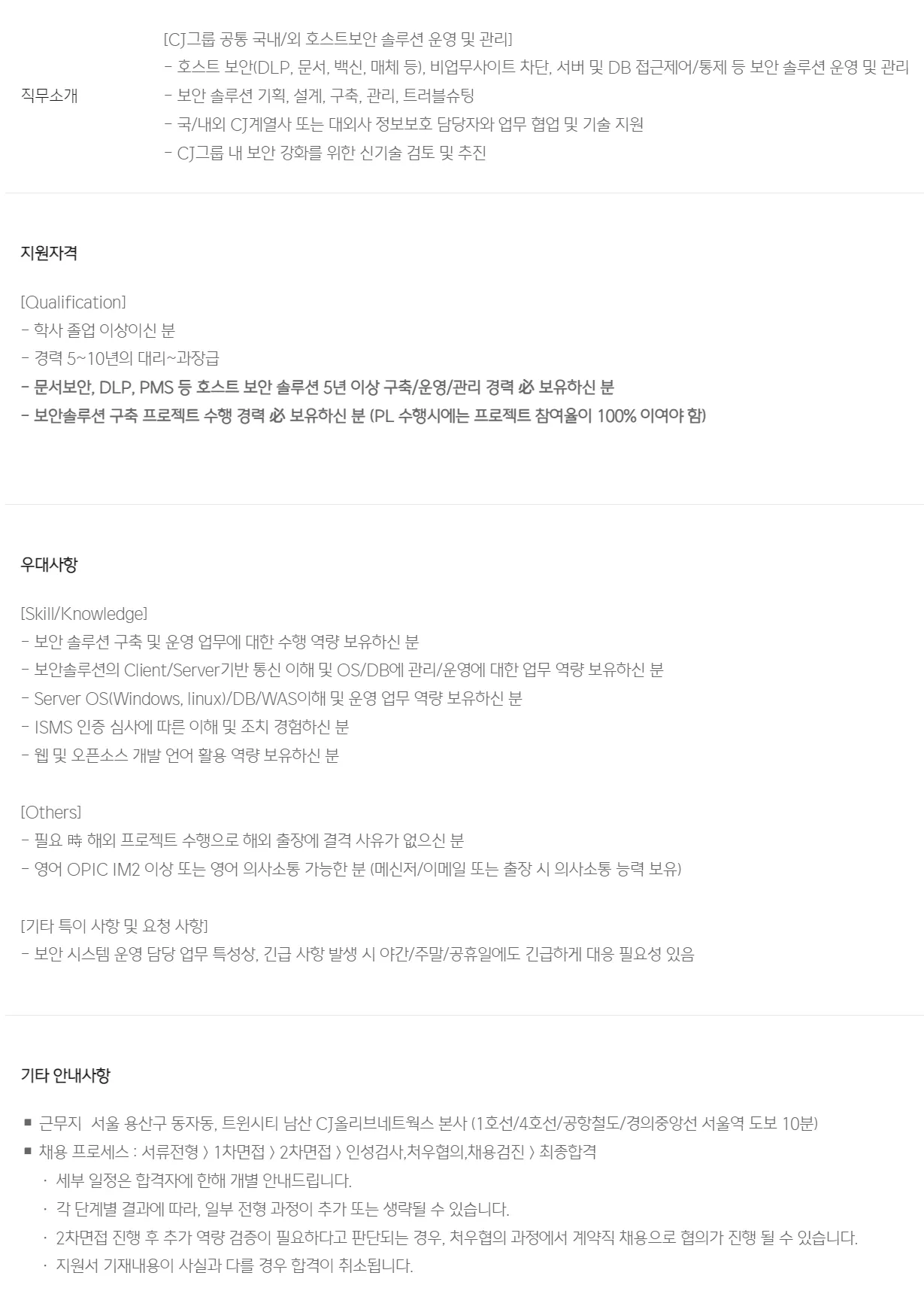 약 6만 여명의 CJ그룹 및 계열사의 보안을 책임지는 업무이기 때문에, 이와 비슷한 규모의 환경에서 업무경험이 있으신 분이면 좋을 것 같습니다.