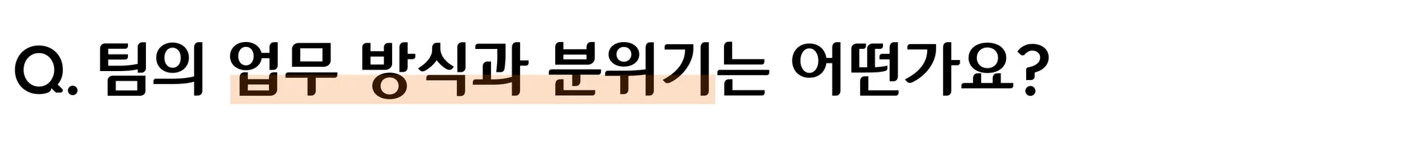 제가 느끼는 팀 분위기는 굉장히 밝고 에너지가 넘쳐요. 개인 의견을 자유롭게 나누는 분위기에요. 이런 환경이 조성될 수 있었던 것은 팀장님과 센터장님 그 밖에도 많은 리더분들부터 수평적이고 자유로운 분위기 조성을 위해서 많은 노력을 해주셔서 가능한 것 같아요. 그리고 최근에 입사하는 후배님들의 당당하고 용기 있는 태도도 긍정적인 분위기 조성에 한몫 하는 것 같습니다.