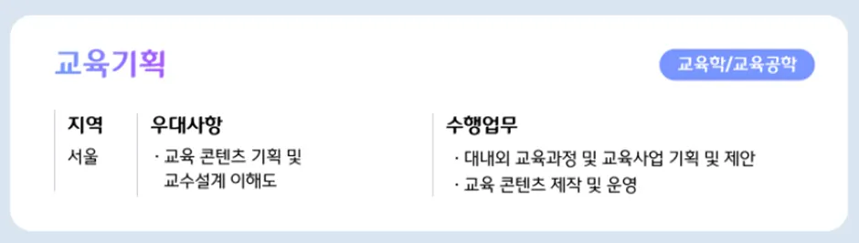 또한, 교육을 수강하는 임직원분들 뿐만 아니라, 강사, 디자이너, 콘텐츠 편집자분들 등 다양한 분들과도 커뮤니케이션이 필요하기 때문에 커뮤니케이션 역량도 필요합니다.