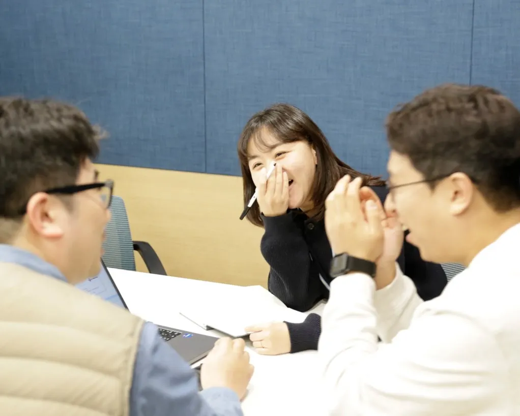 PM업무 특성상 팀원 하나 하나가 각 사업을 주도하고 리드하는 방식이라, 직급이나 나이 무관하게 스스로 판단하고 자유롭게 의견을 내고 결정할 수 있는 분위기예요. 그리고 프로젝트별로 메인과 서브로 서로 협업하기 때문에 어려운 문제는 함께 머리를 맞대고 해결합니다. 일단 무엇보다도 팀 분위기가 워낙 활기차요. 누가 오시더라도 무조건 한달 내로 스며드시게 될 거예요.